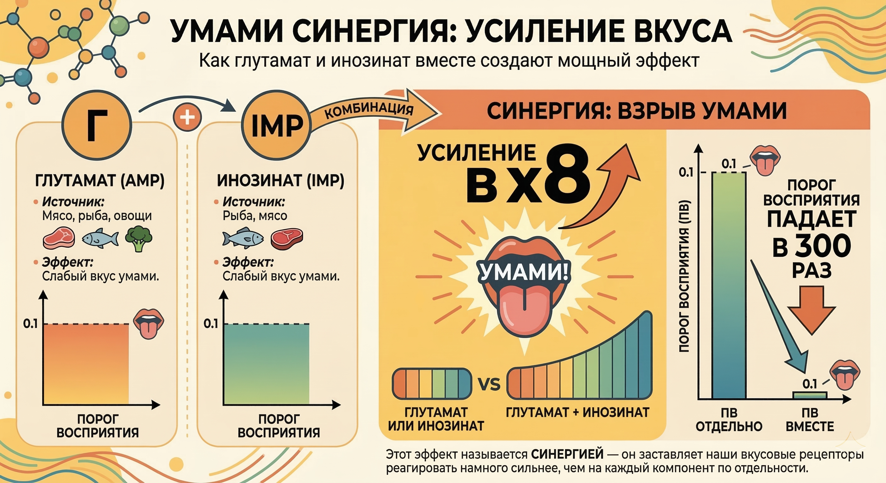 В исследованиях на людях интенсивность умами-вкуса при смешивании глутамата с инозинатом возрастает в 7-8 раз по сравнению с чистым глутаматом. Механизм завязан на рецептор T1R1/T1R3 — нуклеотиды буквально «заклинивают» молекулу глутамата в рецепторе, усиливая и продлевая сигнал.
